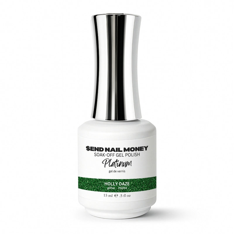 deck your nails in holly daze, a classic holiday green that shimmers with micro-cut platinum glitter. sleek, sparkly, and oh-so-festive, this shade is timeless glam with a seasonal twist.